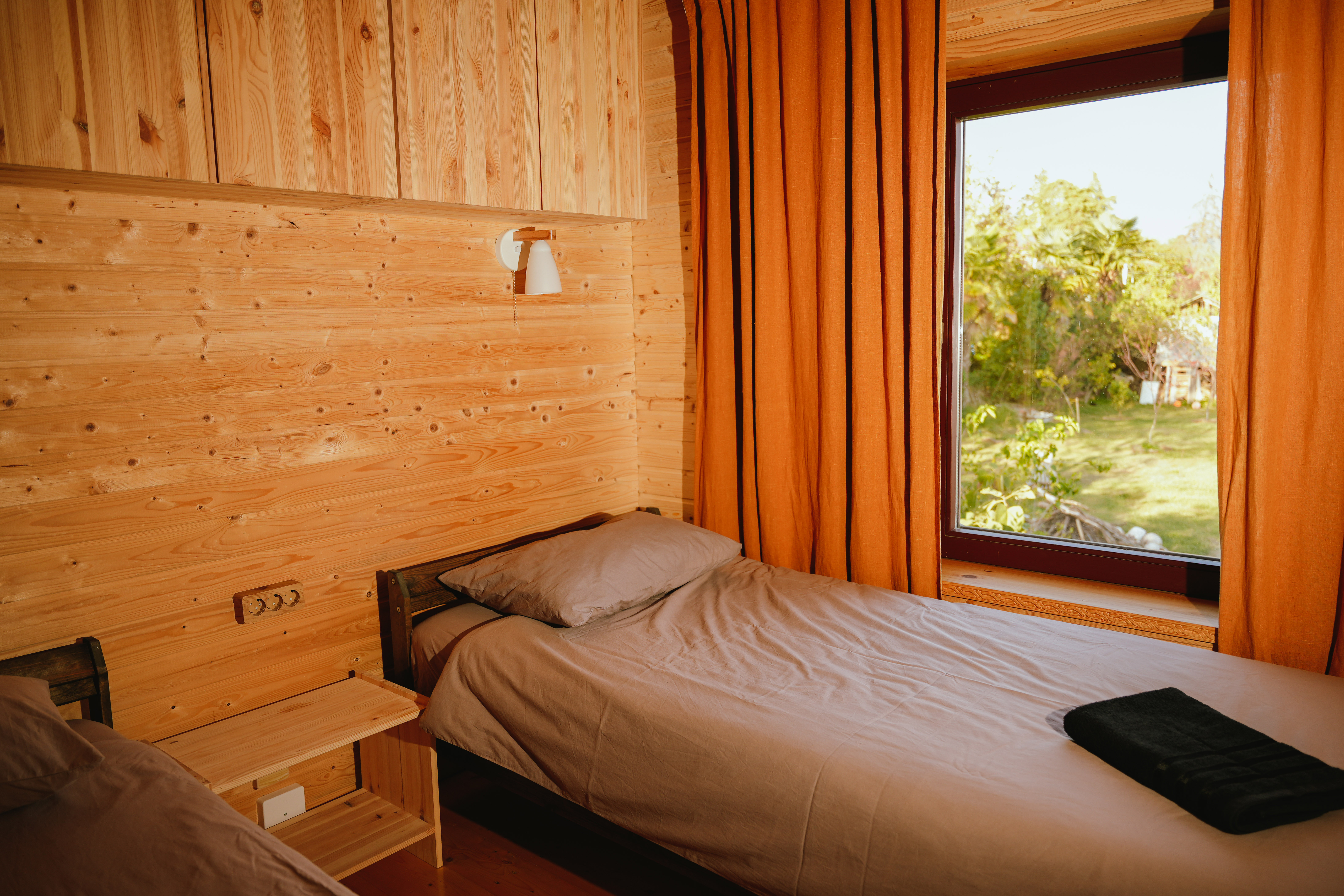 Экологичный стильный домик с отделкой деревом, две двухместные спальни, гостиная, санузел и просторный балкон с видом на море.
